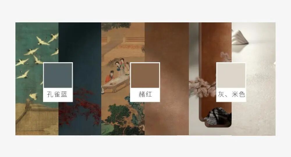 色彩密碼:系列特別提煉出內(nèi)斂溫和的中性色為主色調(diào),以極具宋代特色的孔雀藍(lán)、赭紅色作為配色,點(diǎn)綴于中性色之間,為現(xiàn)代空間注入一抹沉靜而不失格調(diào)的詩意。