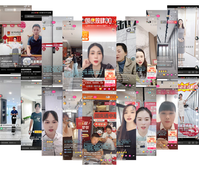 宏陶瓷磚以“直給式短視頻” 為內(nèi)容利刃,精準(zhǔn)切割用戶需求。在短平快的視頻中,不僅清晰呈現(xiàn)產(chǎn)品核心賣點(diǎn),更快速傳遞促銷信息,實現(xiàn)“品效合一”。
