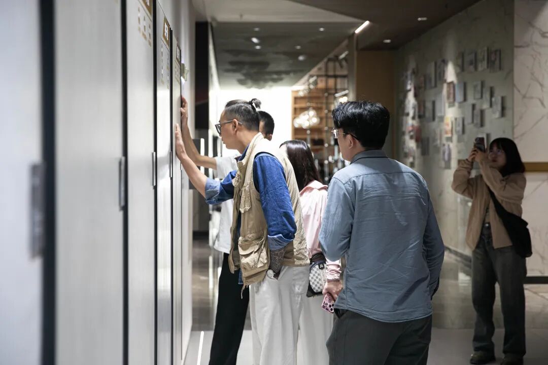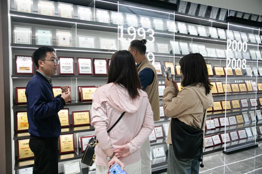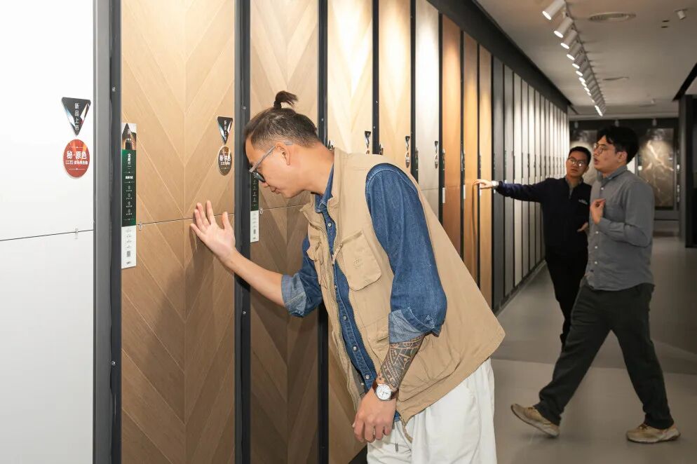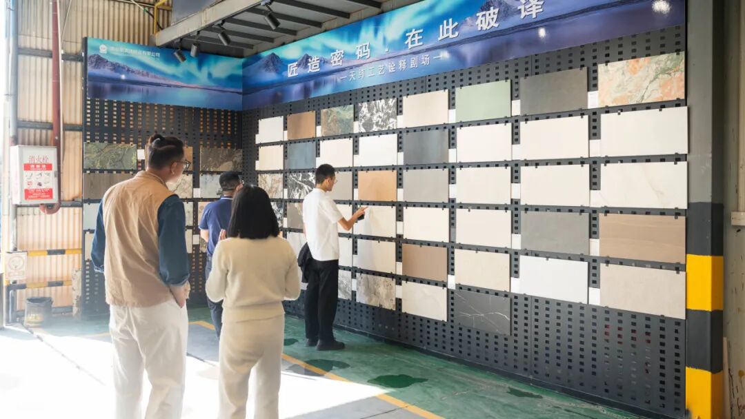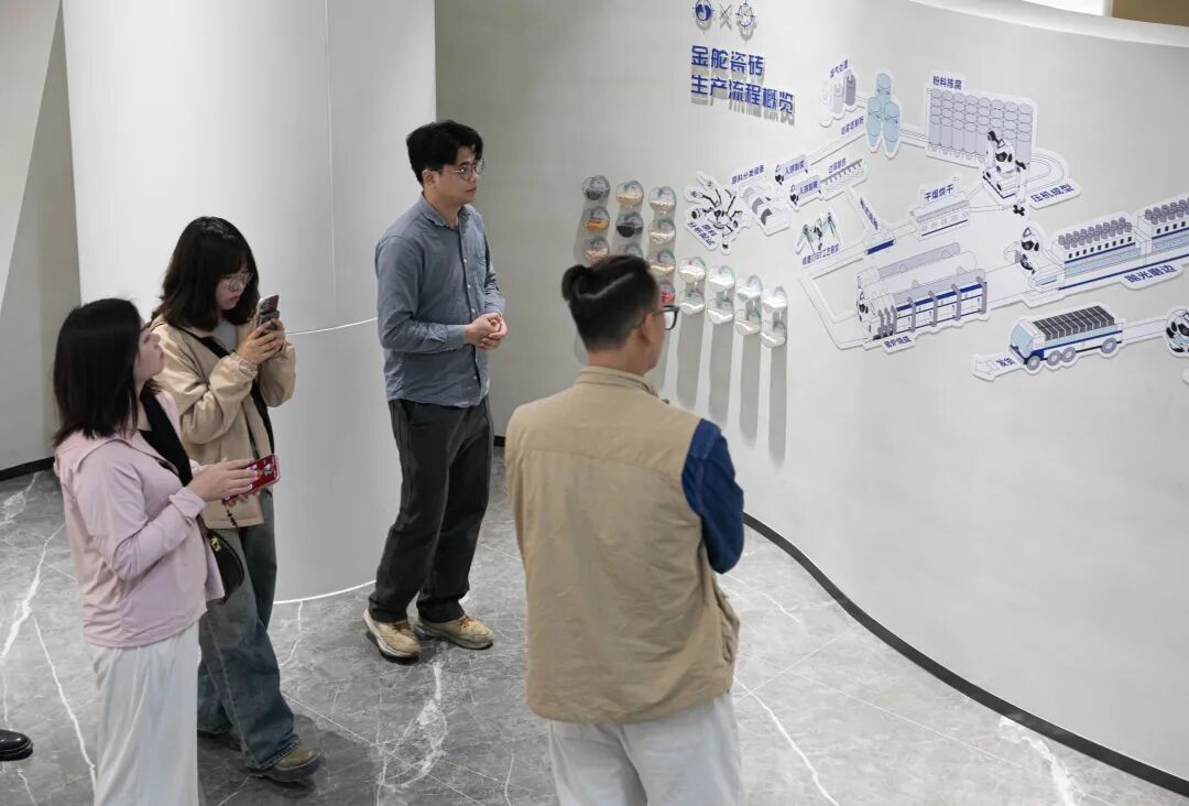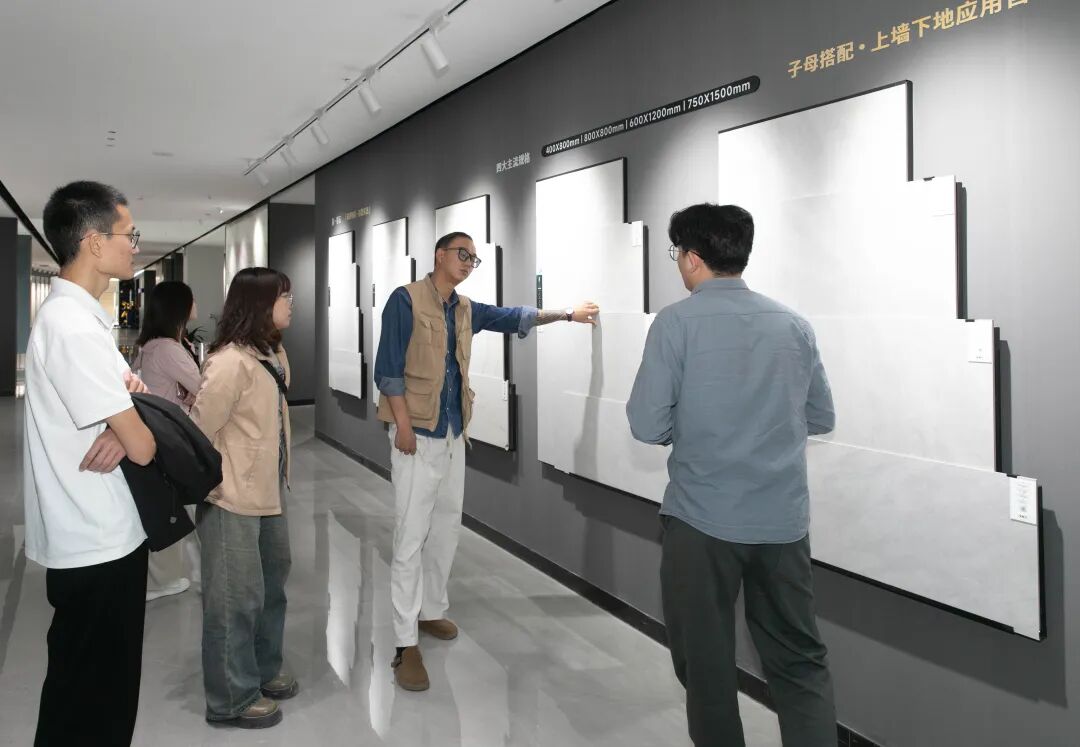 隨后,團隊移步至金舵領航館。在品牌講解員的引導下,設計師們參觀了精心布局的展廳,從生動講述品牌故事的發(fā)展歷程墻,到陳列著琳瑯滿目獎項的榮譽展區(qū),大家深入了解金舵瓷磚不斷創(chuàng)新的品牌精神與深厚文化積淀。