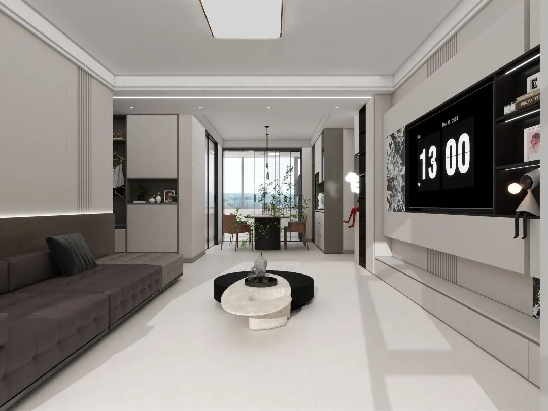 淺米白色調(diào)鋪陳全屋地面,低飽和的底色 + 細(xì)膩的肌理,像一層柔和濾鏡包裹空間,既拉伸了視覺(jué)尺度,又與淺調(diào)墻面、柔感沙發(fā)形成呼應(yīng),讓整體氛圍自帶輕盈柔和的氣質(zhì)。
